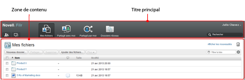 La zone de contenu de Filr est l'emplacement où sont affichées la plupart des informations.