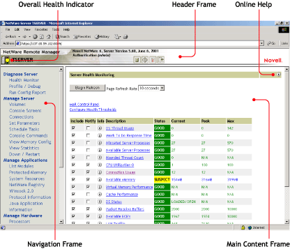 The Web page for NetWare Remote Manager has three main frames: the header frame (top), the navigation frame (left), and the main content frame (right).
