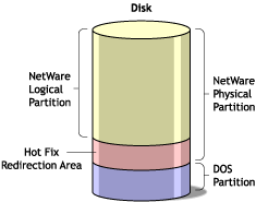 Server hard disks can contain up to four partitions. Each partition contains a data area, where the file system resides, and can contain another data area, called the Hot Fix/mirror object, which is used to manage mirroring and Hot Fix redirection.