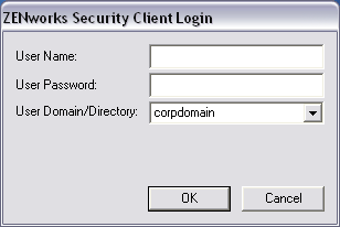 Si vous êtes membre du domaine d'entreprise, le client Endpoint Security Client 3.5 utilise votre nom d'utilisateur et votre mot de passe Windows* pour vous loguer au service de distribution de stratégies (Policy Distribution Service) sans afficher de fenêtre contextuelle. Si vous n'êtes pas membre du domaine qui héberge le service de distribution de stratégies, Endpoint Security Client 3.5 vous invite à entrer votre nom d'utilisateur et votre mot de passe pour ce domaine (voir Figure 2-2).