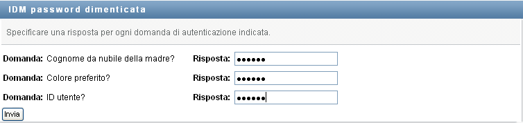 Ai fini dell'accesso all'applicazione utente di Identity Manager, potrebbero venire richiesti altri tipi di informazioni, in base all'eventuale impostazione di norme per le password da parte dell'amministratore del sistema. Ad esempio: