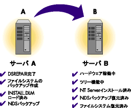 INSTALL.DLMのオプションを使用して、計画しているハードウェアのアップグレード、ハードディスクのアップグレード、またはサーバの交換のために必要なサーバのeDirectory情報を準備できます。次の説明は、実際にサーバを交換する場合を想定しています。この説明では、古いサーバを「サーバA」、それに置き換わる新しいサーバを「サーバB」と呼ぶことにします。