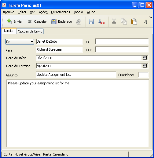 Quando você marcar uma tarefa como concluída, o GroupWise enviará uma notificação ao criador da tarefa se ele tiver selecionado uma notificação de retorno em Opções de Envio. O status Concluído, incluindo a data e o horário em que a tarefa foi marcada como concluída, é colocado na janela Propriedades do criador.