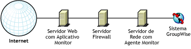 Se o firewall não fornecer um serviço de proxy, será preciso instalar o Aplicativo Monitor em um servidor Web que esteja fora do firewall. Como o Agente Monitor requer acesso direto (caminho mapeado, caminho UNC ou montagem do sistema de arquivos) a um diretório de domínio do GroupWise, ele deve ser instalado em um servidor que esteja localizado dentro do firewall.
