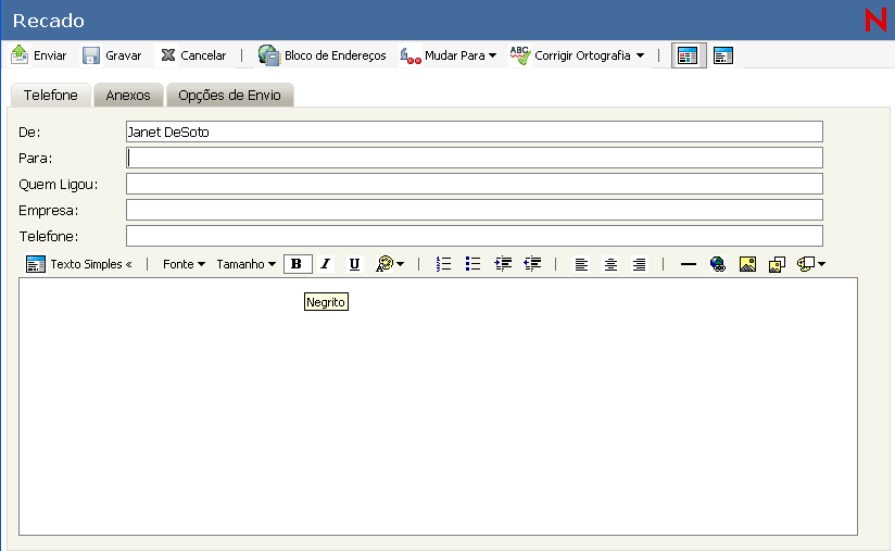 Ao enviar uma mensagem de e-mail do GroupWise, você pode enviá-la como texto ou HTML. Além disso, você pode optar por anexar um arquivo, adicionar uma assinatura à mensagem e verificar a ortografia da mensagem antes de enviá-la.
