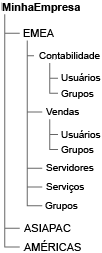 Você pode adicionar MinhaEmpresa/EMEA como container de usuário e, nesse caso, todos os containers localizados abaixo de EMEA estarão visíveis no ZENworks Control Center, inclusive os containers Servidores e Serviços. Apenas usuários e grupos de usuários localizados nos containers EMEA estarão visíveis (servidores e serviços não estarão), porém a estrutura ainda estará exposta.