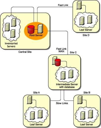• We recommend that there should be high-speed links between the site having the Root Server and the sites having the lower-level Inventory servers.