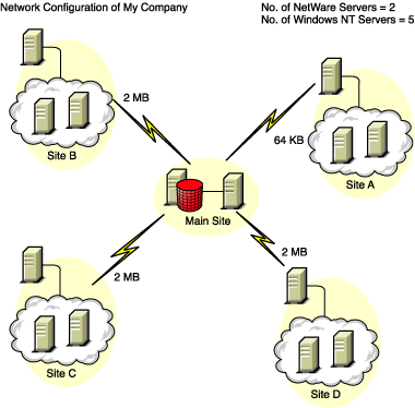 Typical characteristics of each site include two NetWare Inventory servers per site, and three Windows Inventory servers per site. Site B, Site C, and Site D connect to the main site with a WAN connection of 2 MB. The WAN connection between the main site and Site A is 64 KB.