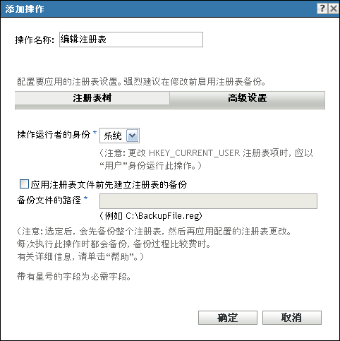 “操作 - 编辑注册表”对话框可让您配置要应用的注册表设置。建议您在应用指定的注册表设置之前先备份注册表,并确保注册表格式正确且经过充分测试。