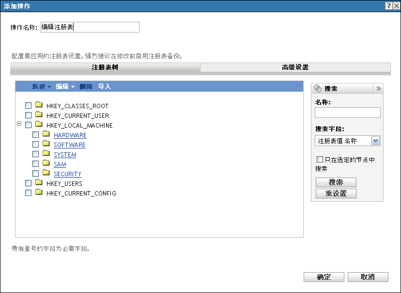 使用“注册表树”页可以在树中选择要向其添加值和注册表项的配置单元,重命名或去除节,或导入注册表文件。