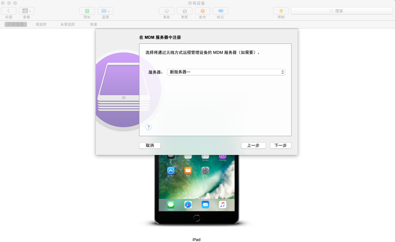 选择设备要注册到的 MDM 服务器。如果下拉菜单中未保存任何 MDM 服务器,则选择新服务器。