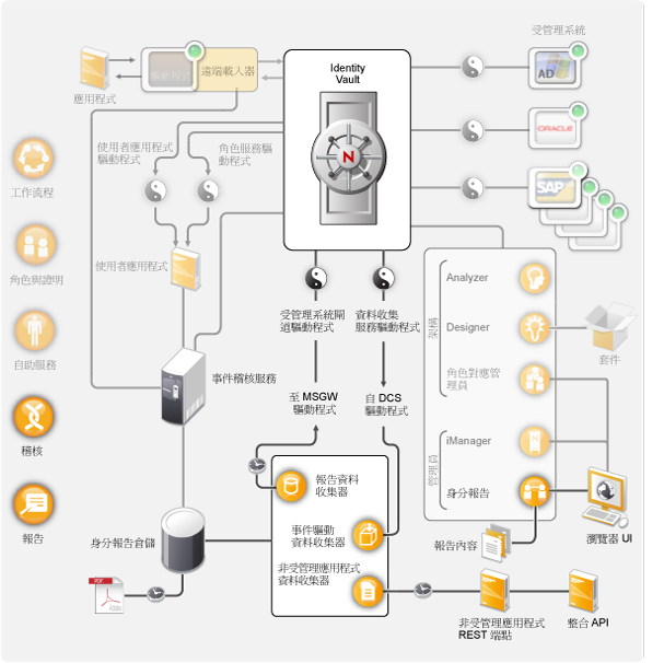 受管理系統閘道驅動程式︰ 從受管理系統收集資訊的驅動程式。為了擷取受管理系統資料,驅動程式會查詢 Identity Vault。擷取的資料包括下列內容︰